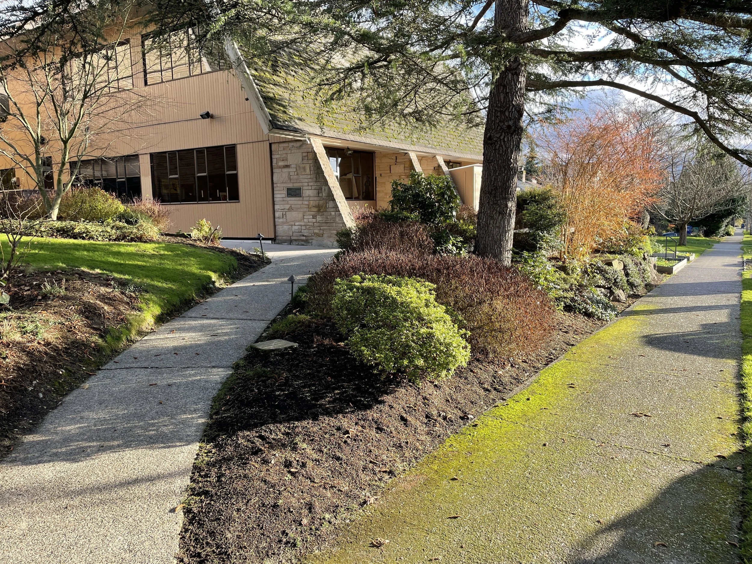 Our entrance is off of 1st Ave NE, south of the Parish Hall.